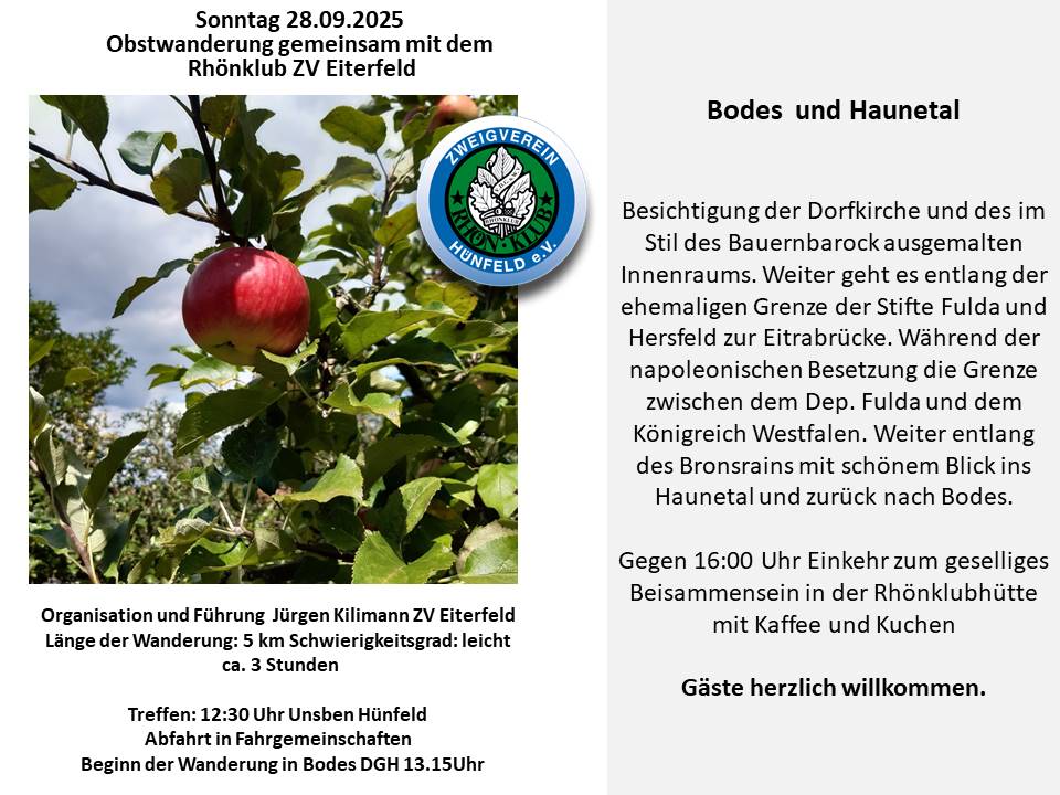 Besichtigung der Dorfkirche und des im Stil des Bauernbarock ausgemalten Innenraums. Weiter geht es entlang der ehemaligen Grenze der Stifte Fulda und Hersfeld zur Eitrabrücke. Während der napoleonischen Besetzung die Grenze zwischen dem Dep. Fulda und dem Königreich Westfalen. Weiter entlang des Bronsrains mit schönem Blick ins Haunetal und zurück nach Bodes.