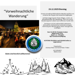 Dort lassen wir bei weihnachtlich dekorierter Atmosphäre, kulinarischen Leckereien und guter Stimmung den Wandertag bei einem Heissgetränk ausklingen.