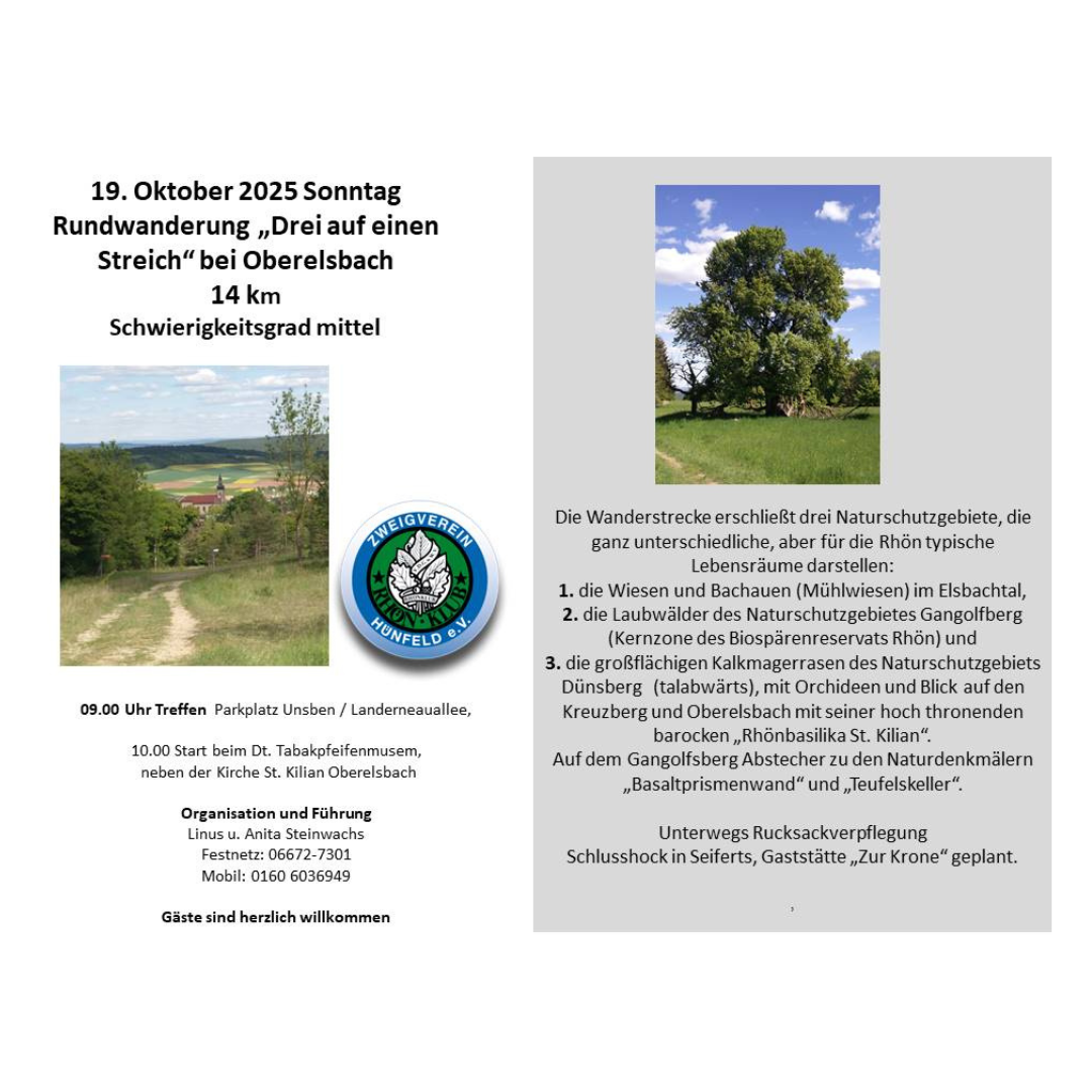 Hünfeld, Parkplatz Unsben Zu den Unsben, Hünfeld, Hessen, DeutschlandSonntag, 19.10.2025 Rundwanderung „Drei auf einen Streich“ bei Oberelsbach 14 km , Schwierigkeit mittel Die Wanderstrecke erschließt drei Naturschutzgebiete, die ganz unterschiedliche, aber für die Rhön typische Lebensräume darstellen: die Wiesen und Bachauen (Mühlwiesen) im Elsbachtal, die Laubwälder des Naturschutzgebietes Gangolfberg (Kernzone des Biospärenreservats Rhön) und die großflächigen Kalkmagerrasen des Naturschutzgebiets Dünsberg (talabwärts), mit Orchideen […]