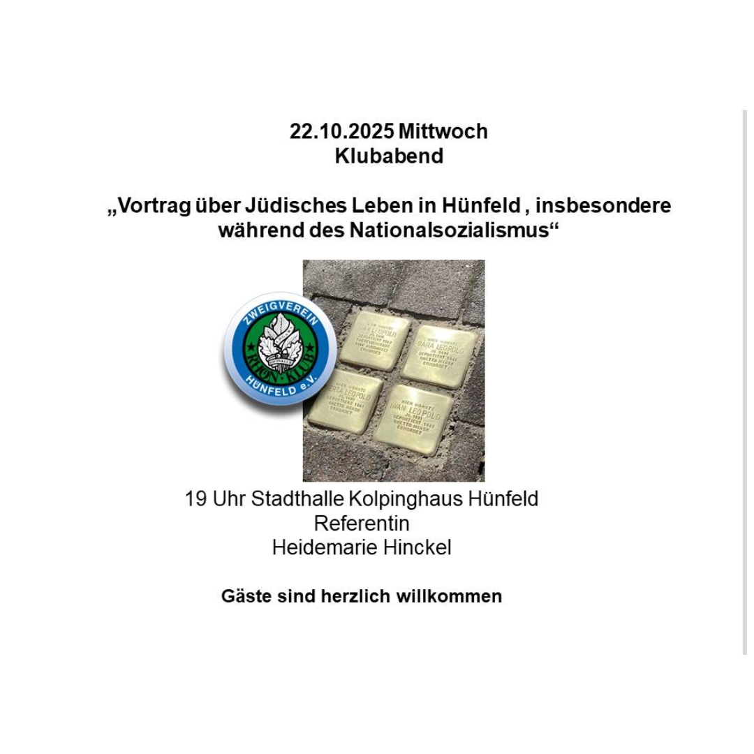 Hünfeld Kolpinghaus Klingelstraße 14, 36088 Hünfeld, Deutschland22.10.2025 Mittwoch Klubabend um 19 Uhr in der Stadthalle Kolpinghaus Hünfeld „Vortrag über Jüdisches Leben in Hünfeld, insbesondere während des Nationalsozialismus“ Referentin Heidemarie Hinckel Unter den Nationalsozialisten wurde das jüdische Leben in Hünfeld systematisch ausgelöscht: Die Synagoge wurde in der Reichspogromnacht 1938 niedergebrannt, die Zahl der jüdischen Einwohner brach zwischen 1933 und 1939 stark […]